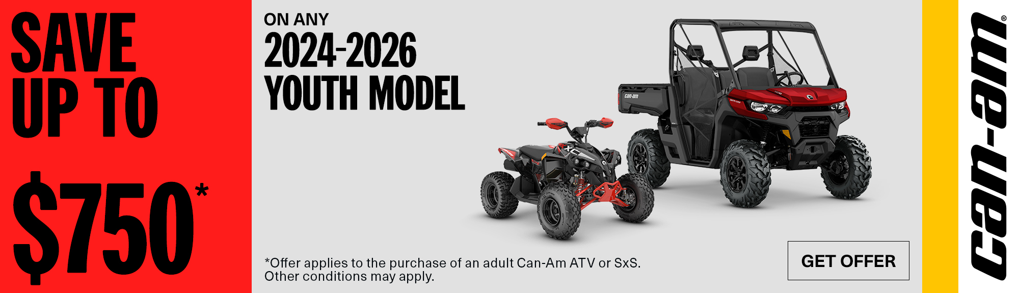† Get up to a $750 rebate on eligible models: Consumers who purchase a new and unused 2024-2026 adult Can-Am ATV, Can-Am SSV, Lynx or Ski-Doo model (excl. NEOs) are eligible to an additional $500 rebate on any 2024-2026 eligible Youth model. To receive up to $750, the additional $500 must be combined to the $250 retail rebate available to 2024-2025 Youth models. A single $250 rebate is available for consumer purchasing only a Youth 2024-2025 model. Offer subject to change without notice. Financing promotions void where prohibited.